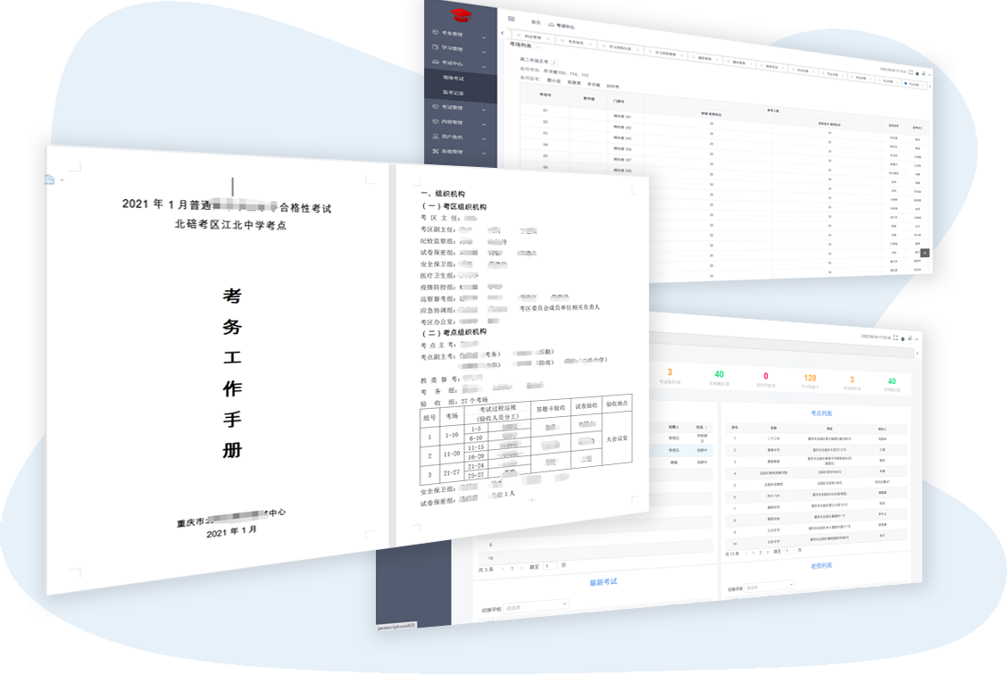 - 快捷的考場生成和安排功能,可幫助考式中心、考點快速安排考場和監考老師。